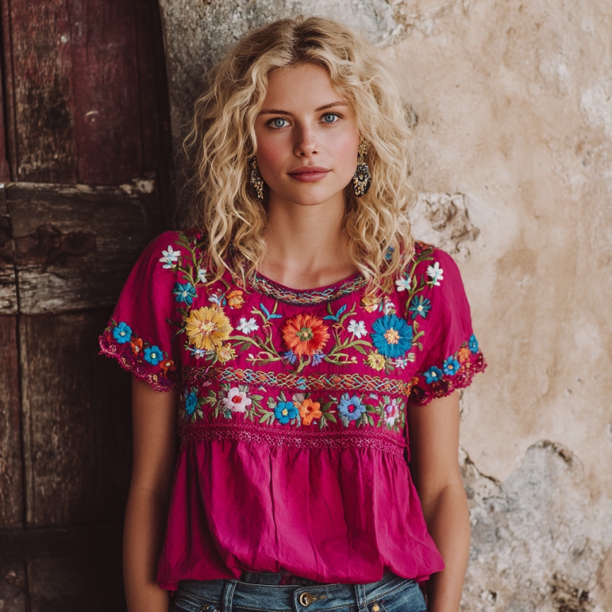 Women's Floral Embroidered Art Print Flowy Linen Blend Casual Tops