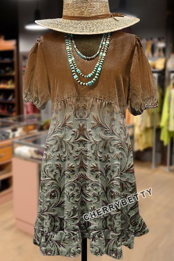 Vintage 3D Floral Print Ruffle Hem Dress