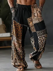 Men's Spring Leopard Patchwork Art Print Flowy Linen Blend Casual Pants