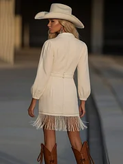 Make a bold fashion statement with the Retro High-End Fashion Tassel Splicing Denim Mini Dress. This dress combines the timeless appeal of denim with a touch of high-end fashion, featuring unique tassel splicing that adds a playful yet sophisticated flair. The denim fabric offers durability and comfort, while the intricate splicing design adds texture and movement, creating a dress that stands out in both casual and chic settings.