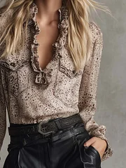 2. Design: The blouse features a classic leopard print pattern, adding a trendy edge.Unique ruffled V-neck that enhances neckline and adds a feminine touch.