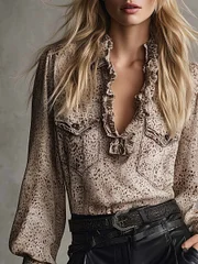 The Vintage Western Ruffled V-neck Beige Leopard Print Suede Blouse is a unique blend of retro charm and modern style. This blouse is crafted from high-quality suede material featuring a captivating leopard print that adds a touch of wild elegance to your wardrobe. The blouse boasts a flattering V-neckline with intricate ruffles that bring a vintage western flair to the design.