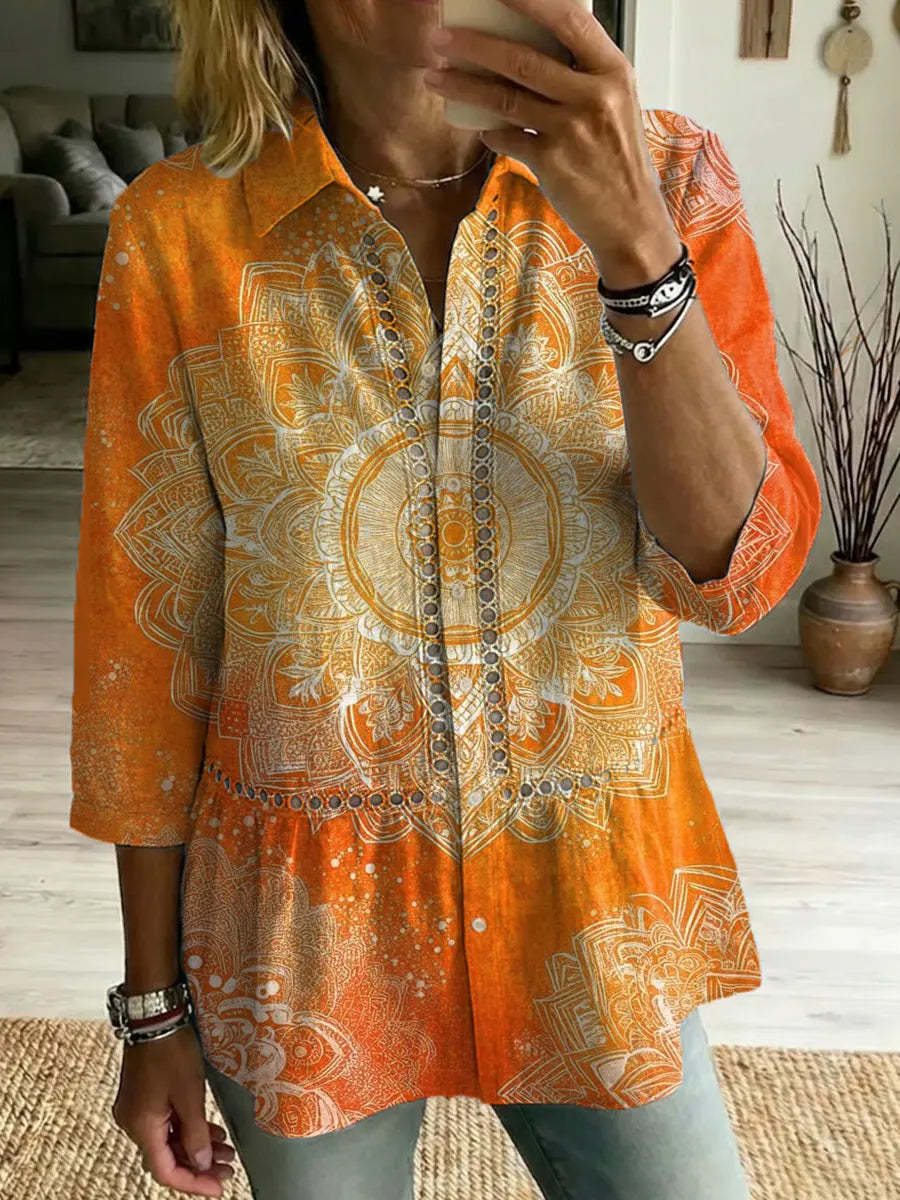 Women's Retro Floral Art Print Casual Lapel Cotton Shirt