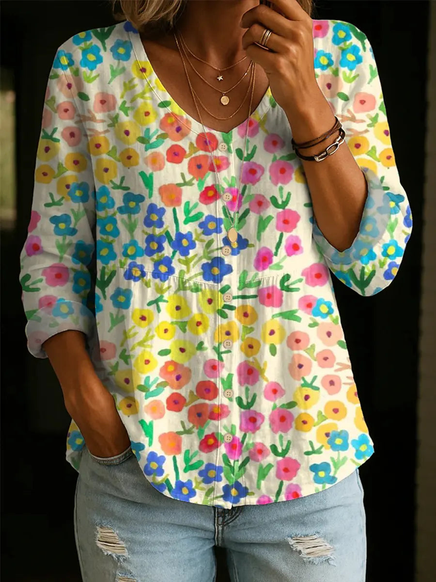 Women's Vintage Flower Art Print Casual Cotton Shirt