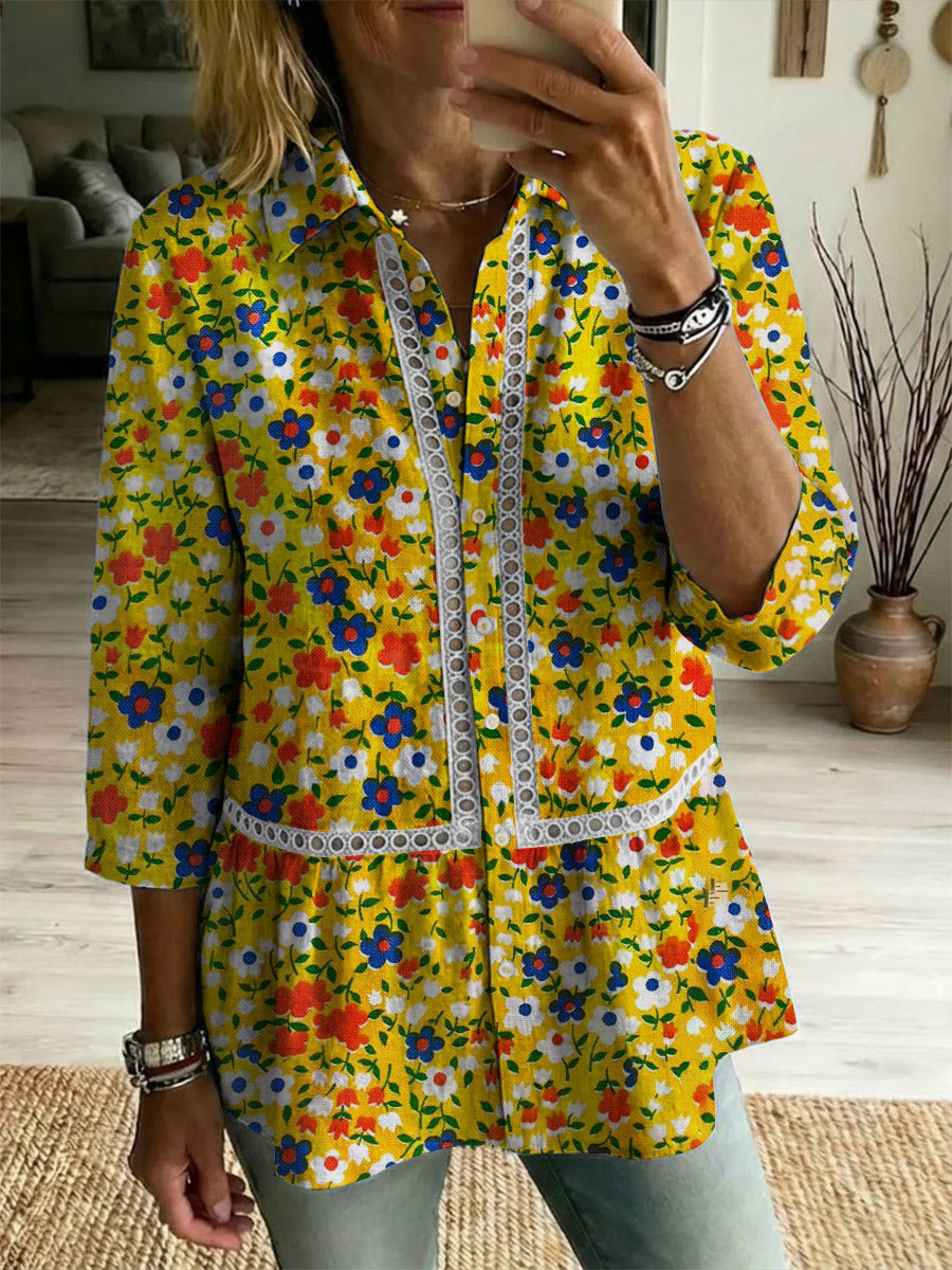 Women's Flower Art Print Casual Lapel Cotton Shirt
