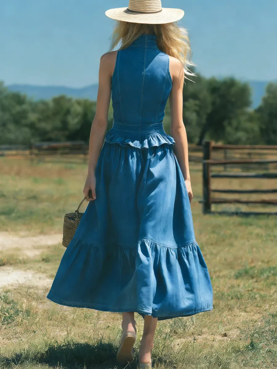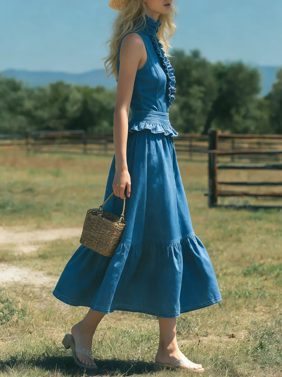 Women's Retro Elegant Stylish Zip High-Neck Sleeveless Ruffled Denim Dress