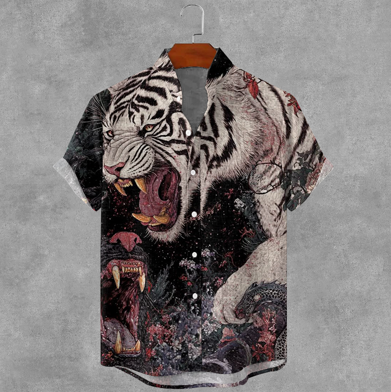 Men's Tiger Art Print Short Sleeve Linen Blend Shirt