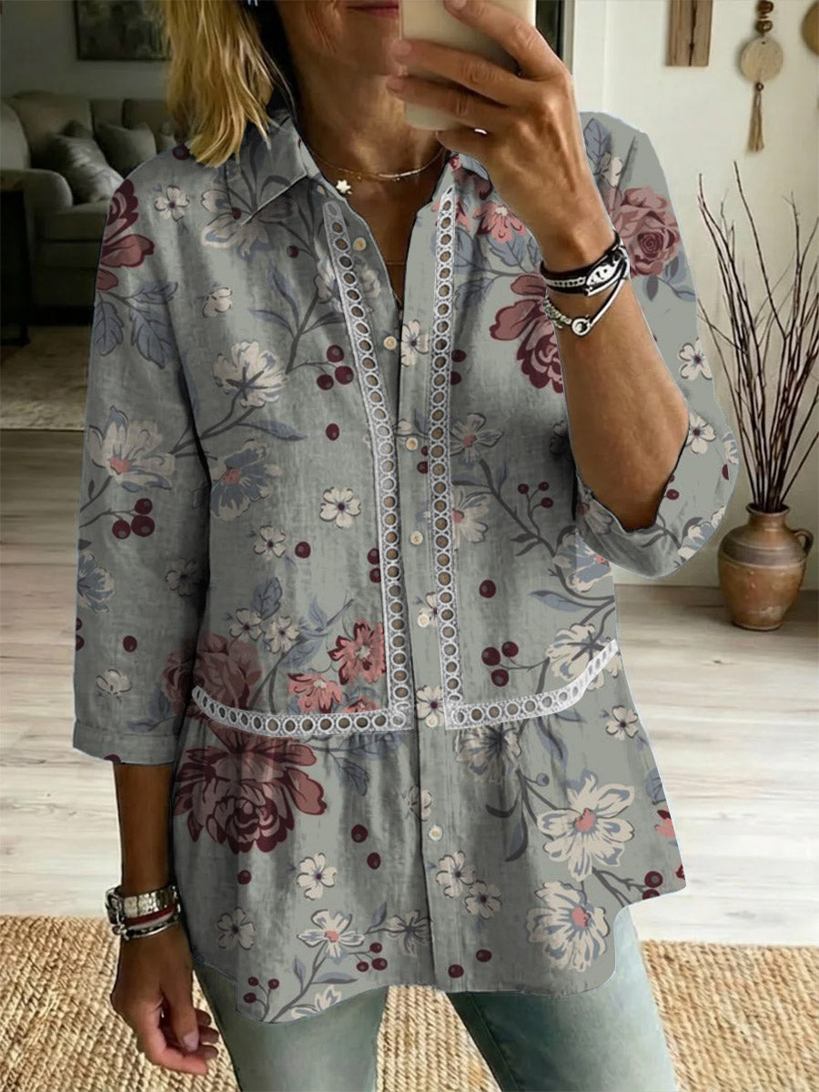 Women's Flower Art Print Casual Lapel Cotton Shirt