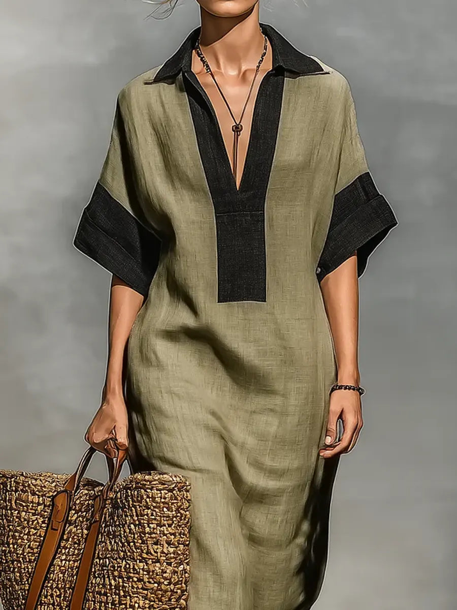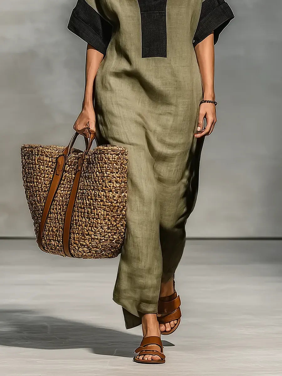 Women's Minimalist Cotton Linen Color-blocked Casual Maxi Dress