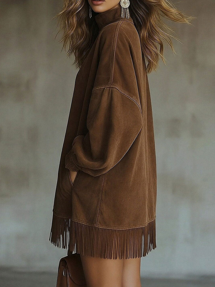 Women's Stand Collar Retro Loose Pocket Tassel Long Sleeve Dress