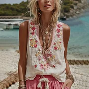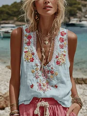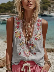 Women's Vintage Floral Embroidery Casual Sleeveless Top