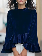 Round Neck Velvet Ruffle-Trim Blouse