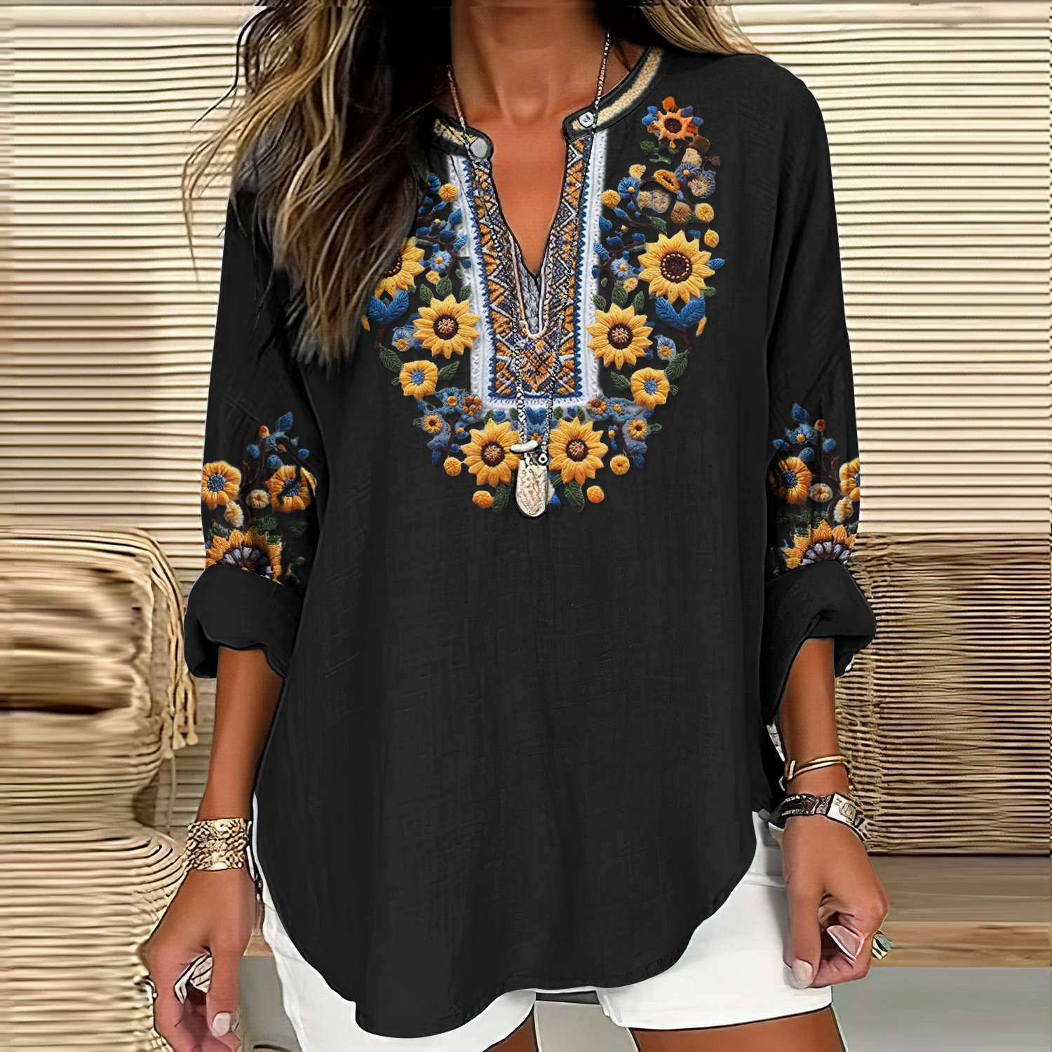 Women's Ukraine Sunflower Embroidery Art V-neck Casual Linen Blend Blouse
