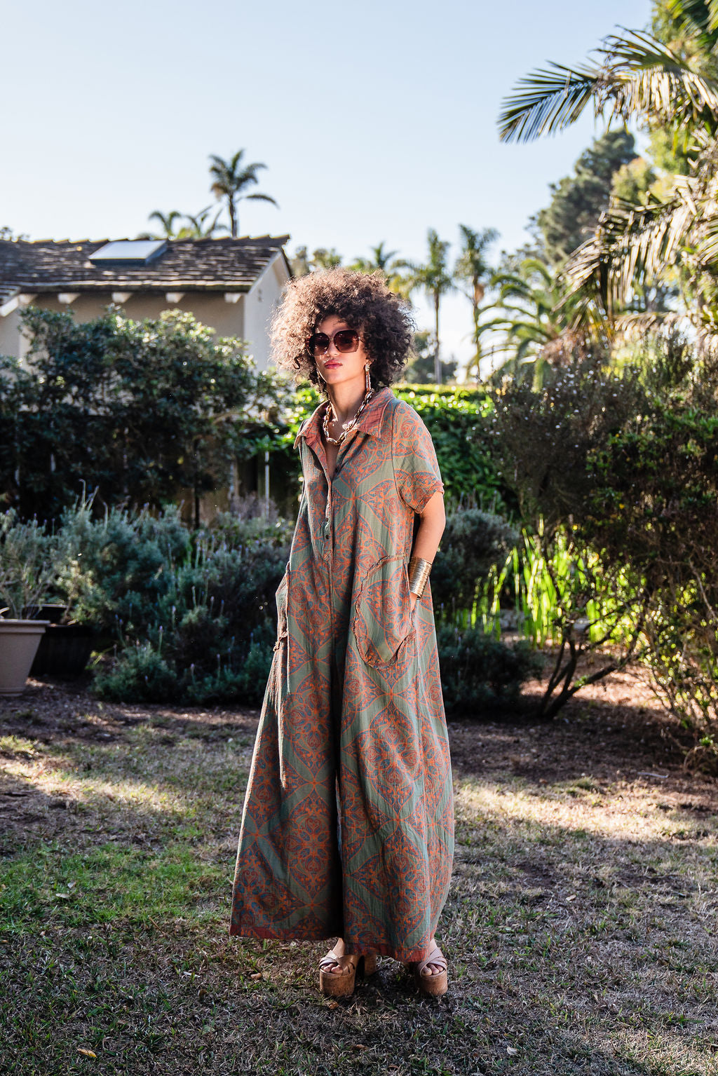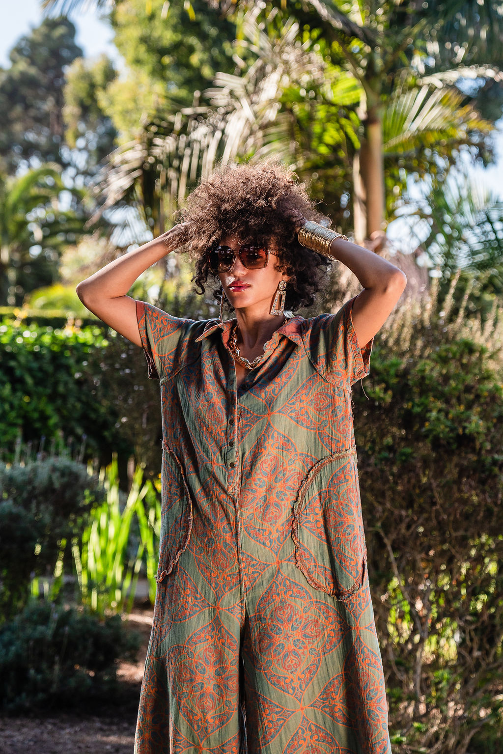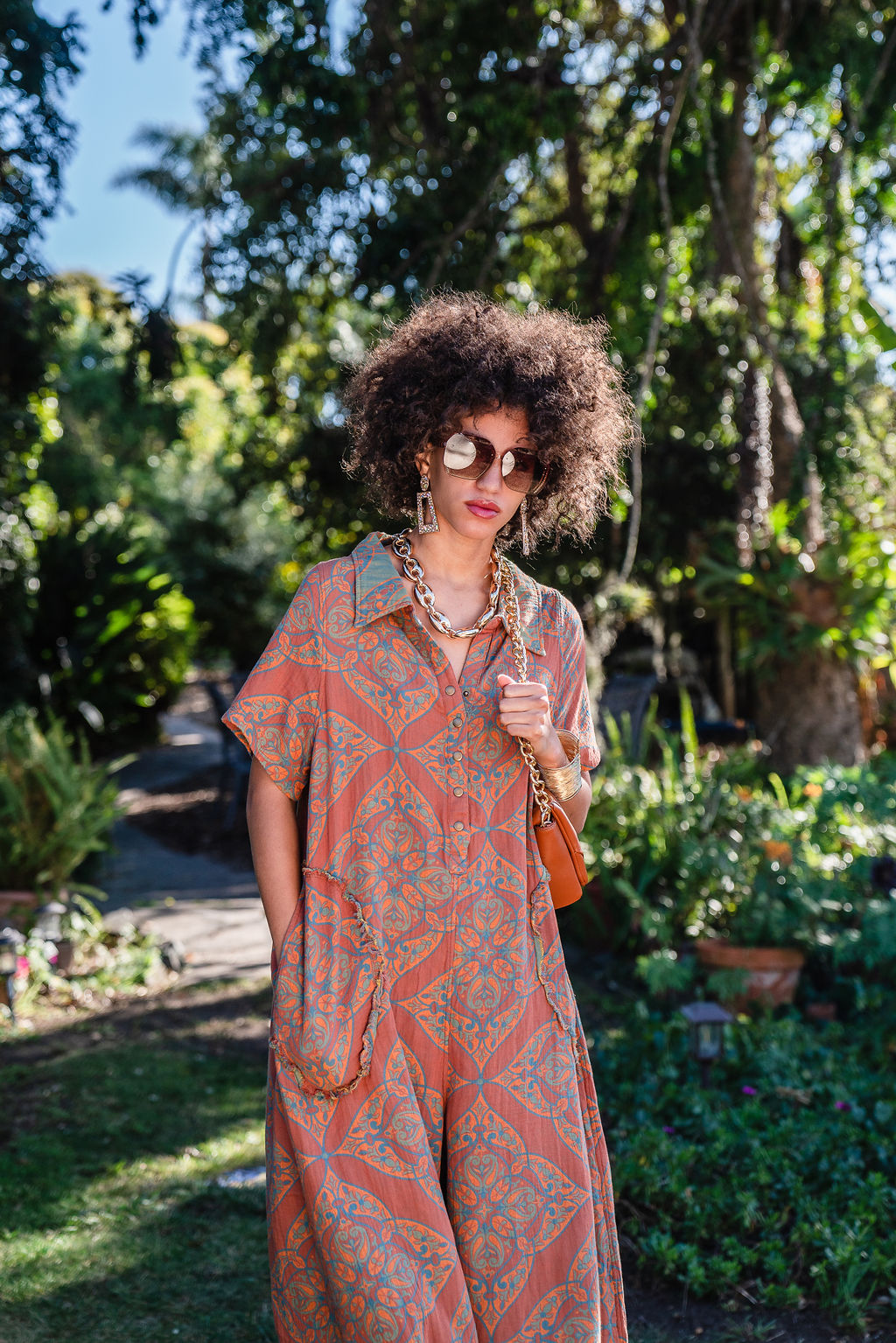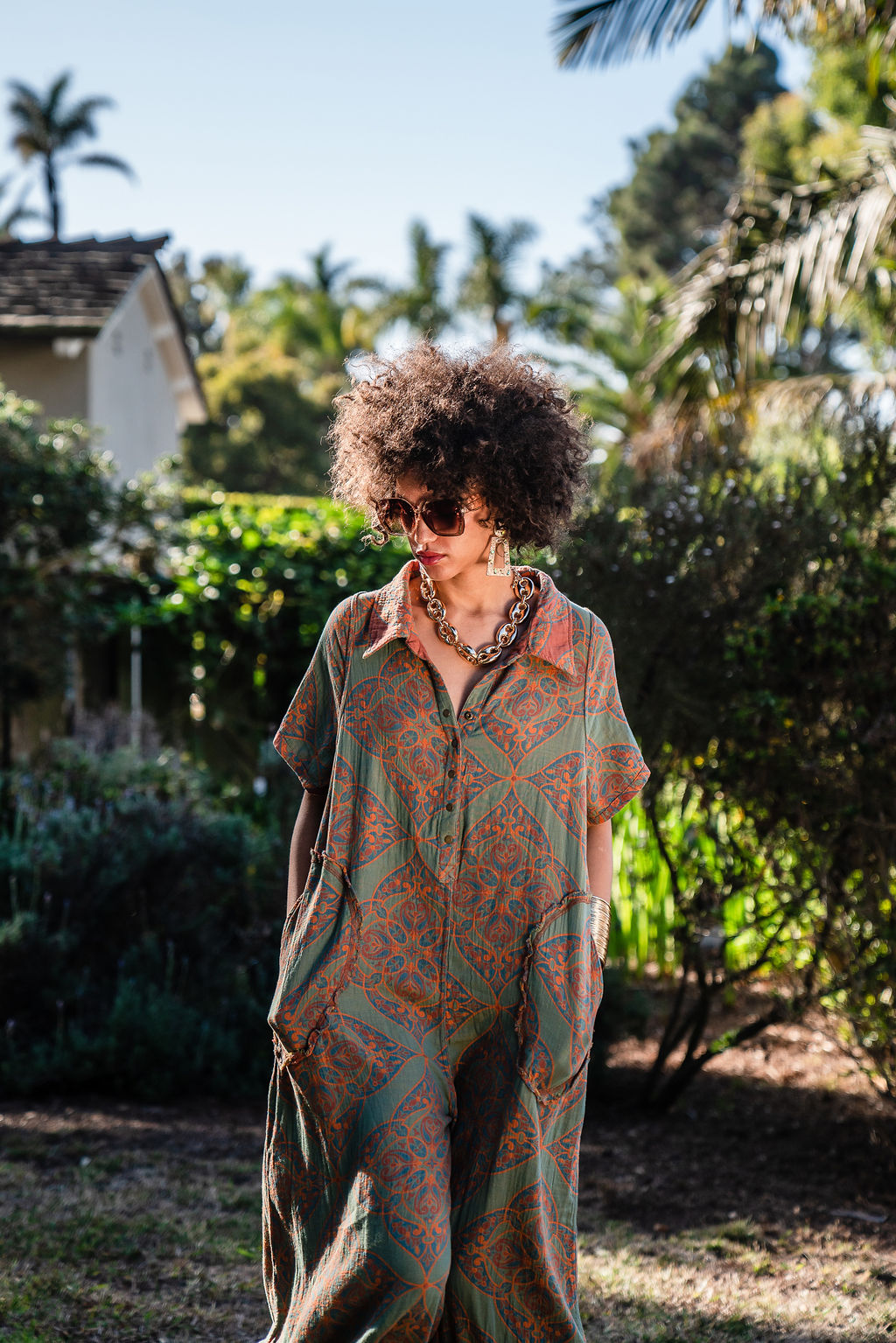 Printed Button Short Sleeve Reversible Jumpsuit with mineral wash detail, relaxed fit and true to size.