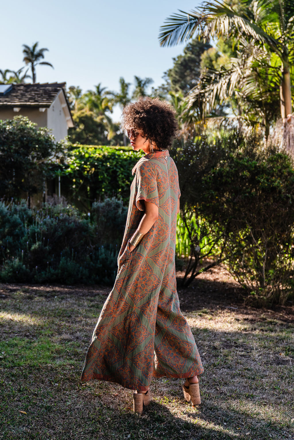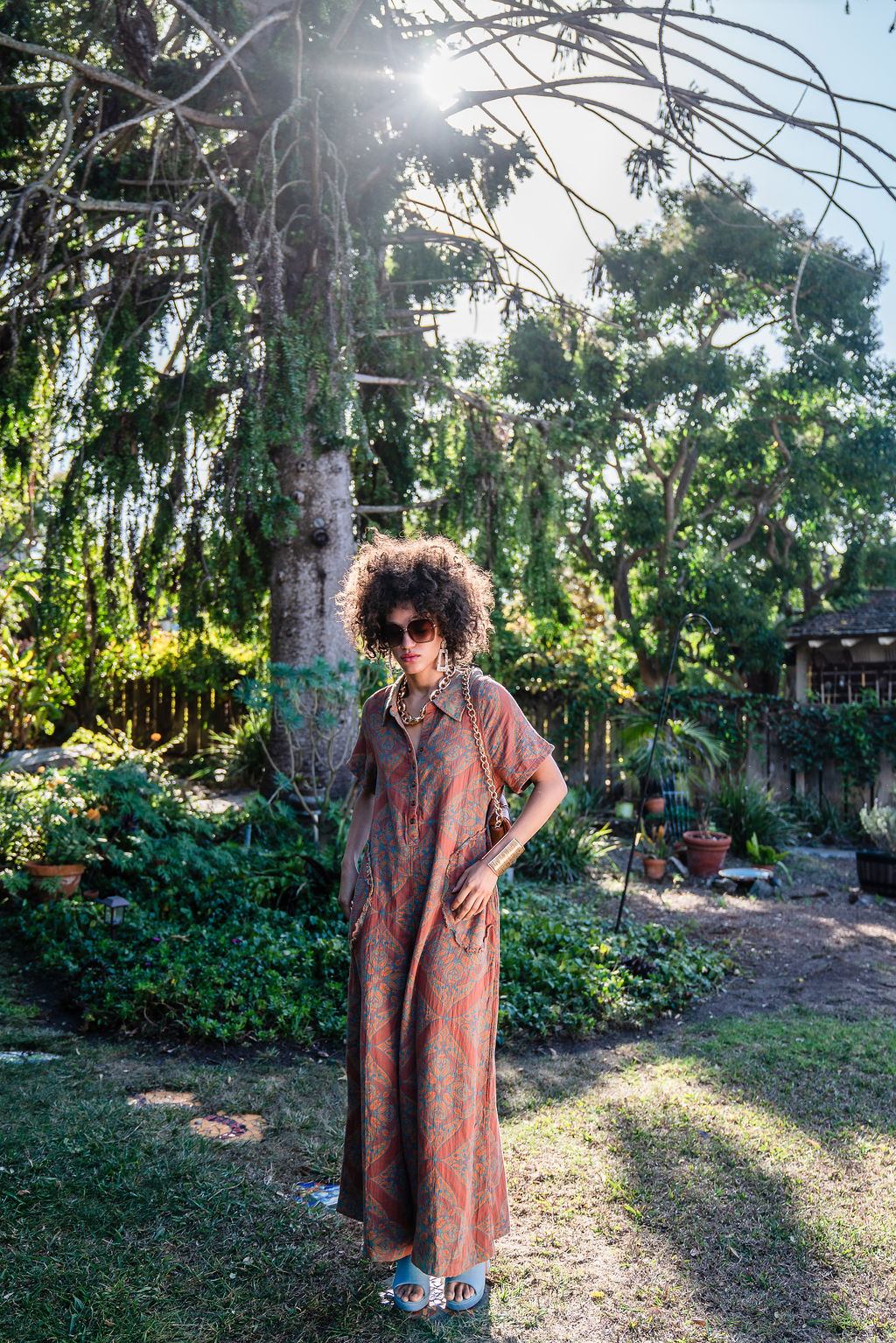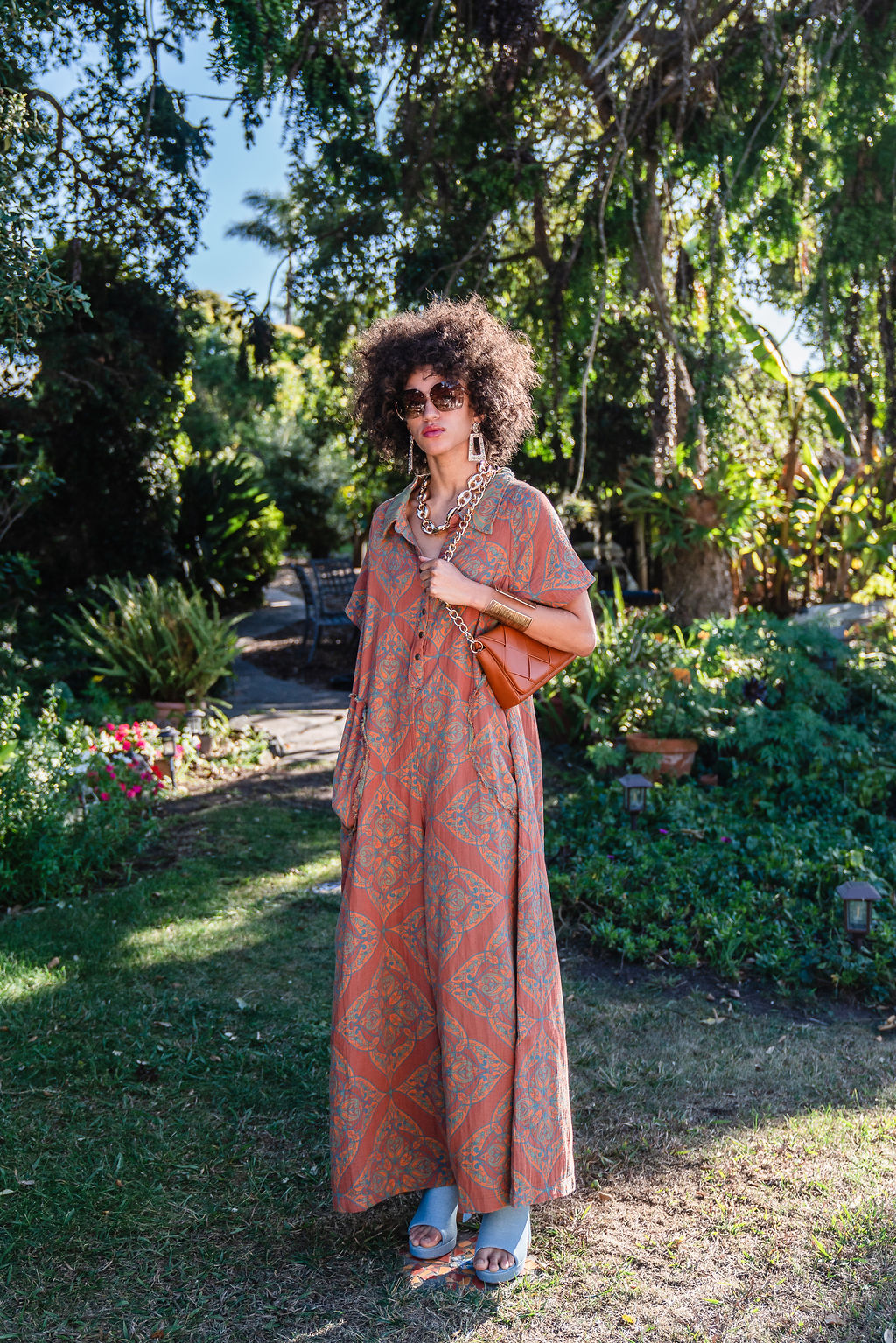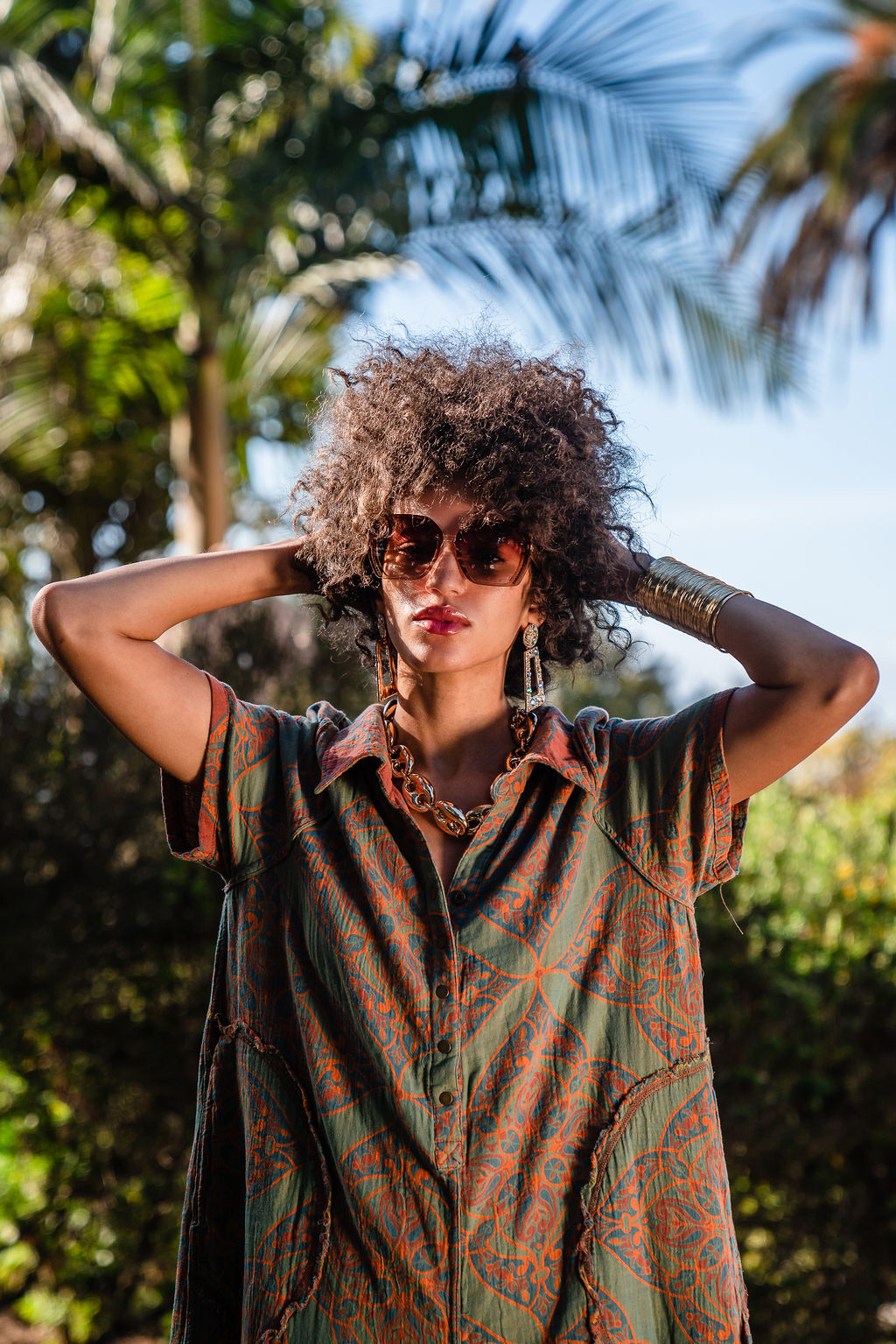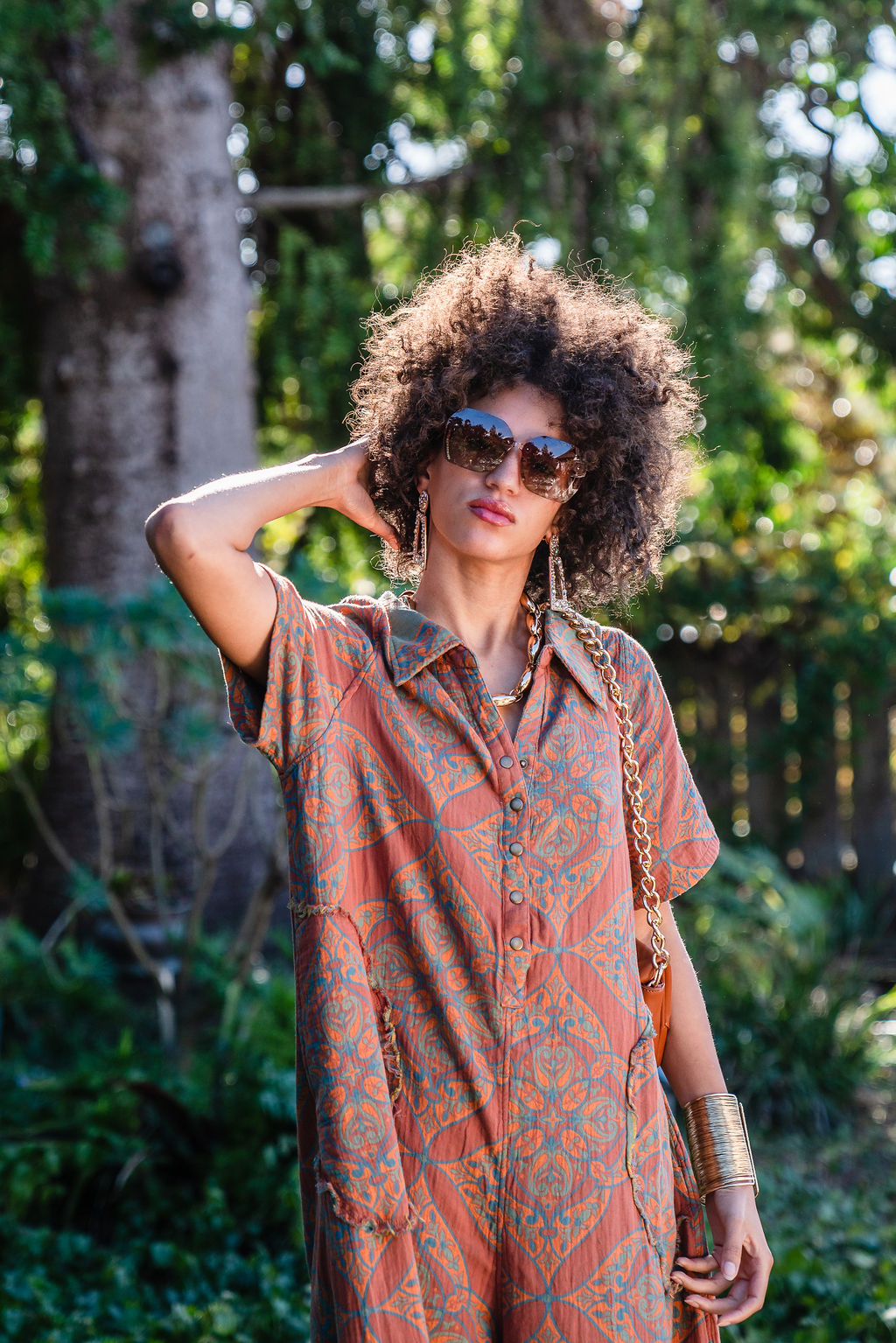 Printed Button Short Sleeve Reversible Jumpsuit with mineral wash detail, relaxed fit and true to size.