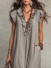 The Bohemian Sleeveless Ruffle V-Neck Flowy Maxi Dress is a captivating addition to any wardrobe. This dress features a delicate, flowing design that exudes elegance and free-spirited charm. The sleeveless silhouette and ruffle detailing around the V-neckline add a touch of romantic flair, making it perfect for various occasions.