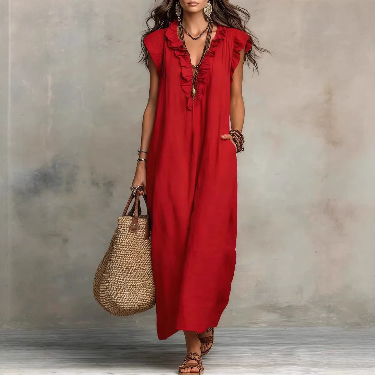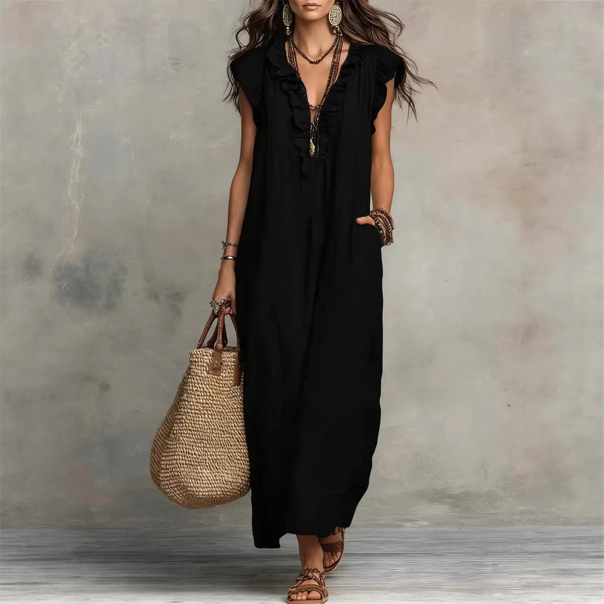 The Bohemian Sleeveless Ruffle V-Neck Flowy Maxi Dress is a timeless piece that blends elegance with casual charm. Its flowy fabric and intricate detailing make it a standout choice for those looking to embrace their inner bohemian spirit while maintaining a touch of sophistication.