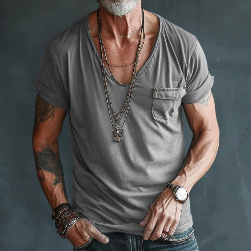 Men's V Neck Breast Pocket Short Sleeve Cargo T-Shirt