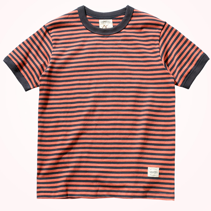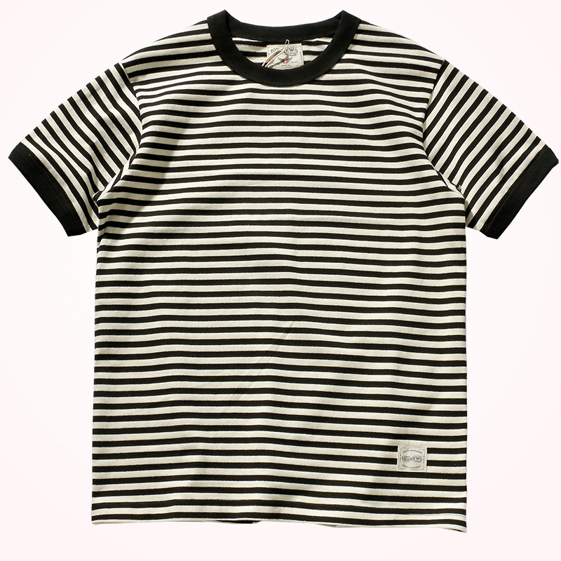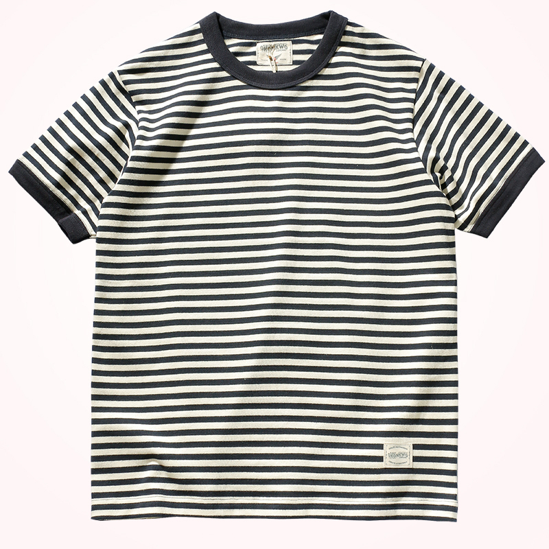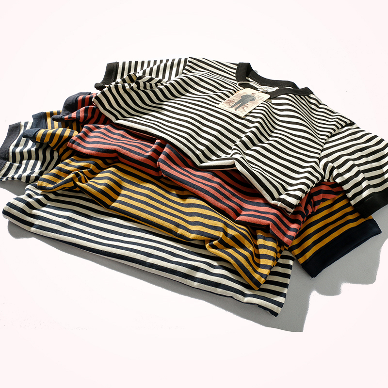 Vintage Double Yarn Pure Cotton Round Neck Striped Short-Sleeved T-Shirt