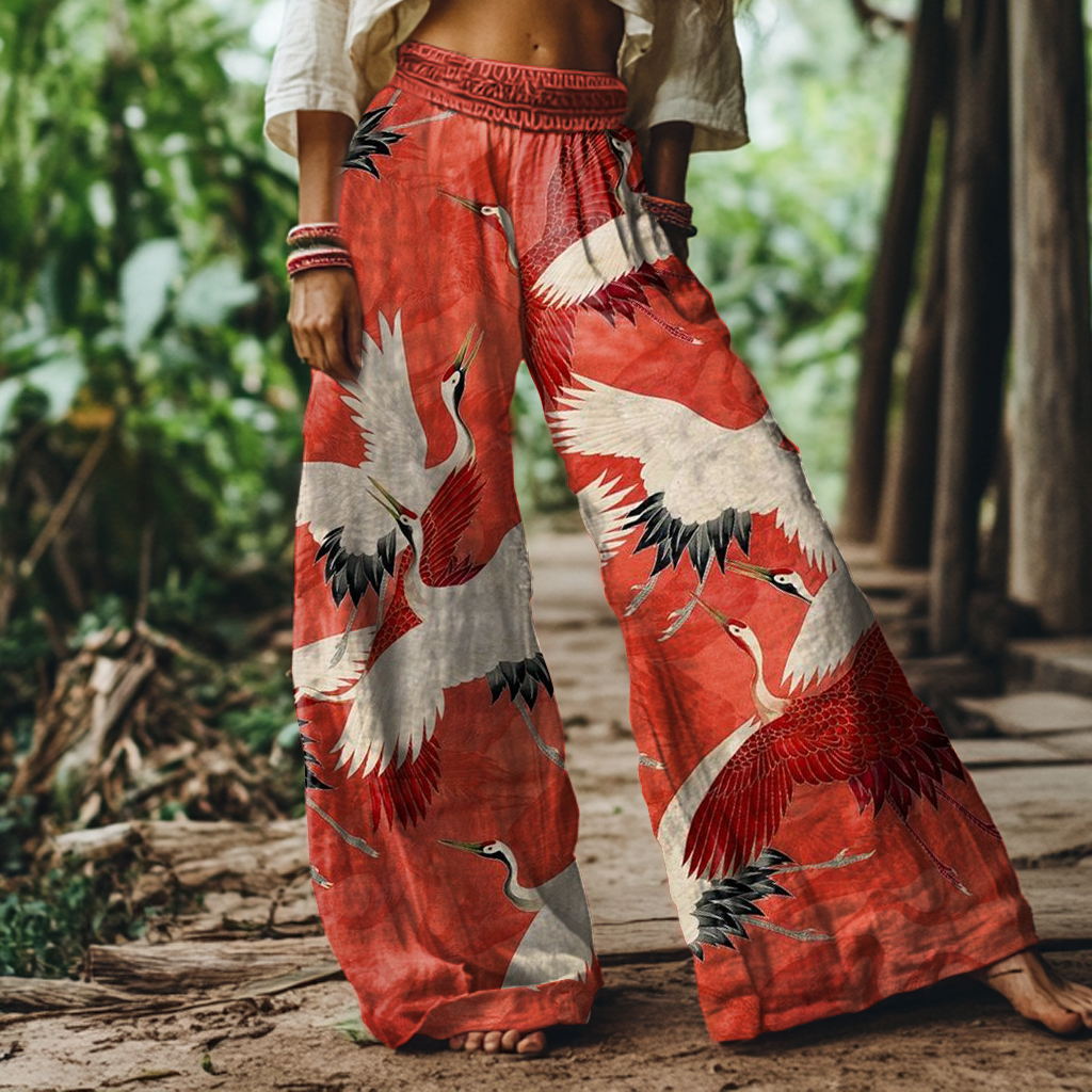 Vintage Japanese Crane Print Loose Wide Leg Pants
