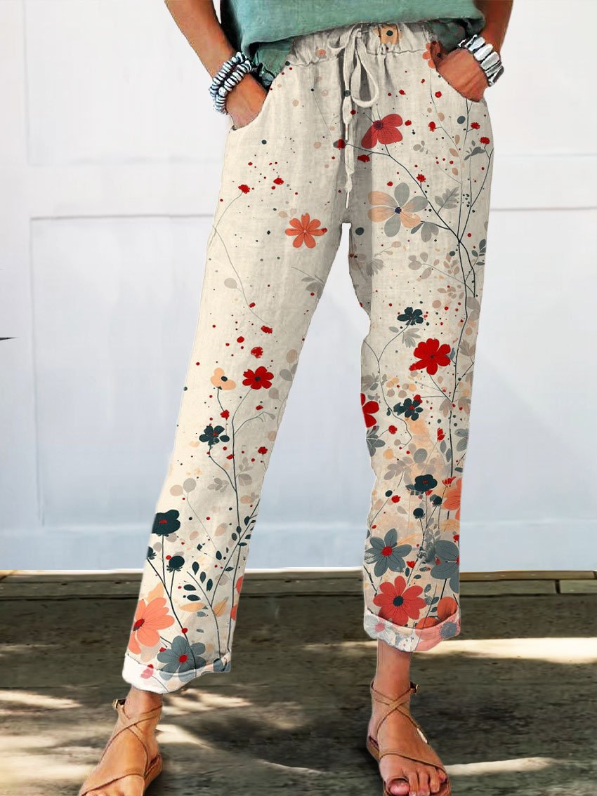 Women's Vintage Lovely Floral Art Printed Cotton And Linen Casual Pants