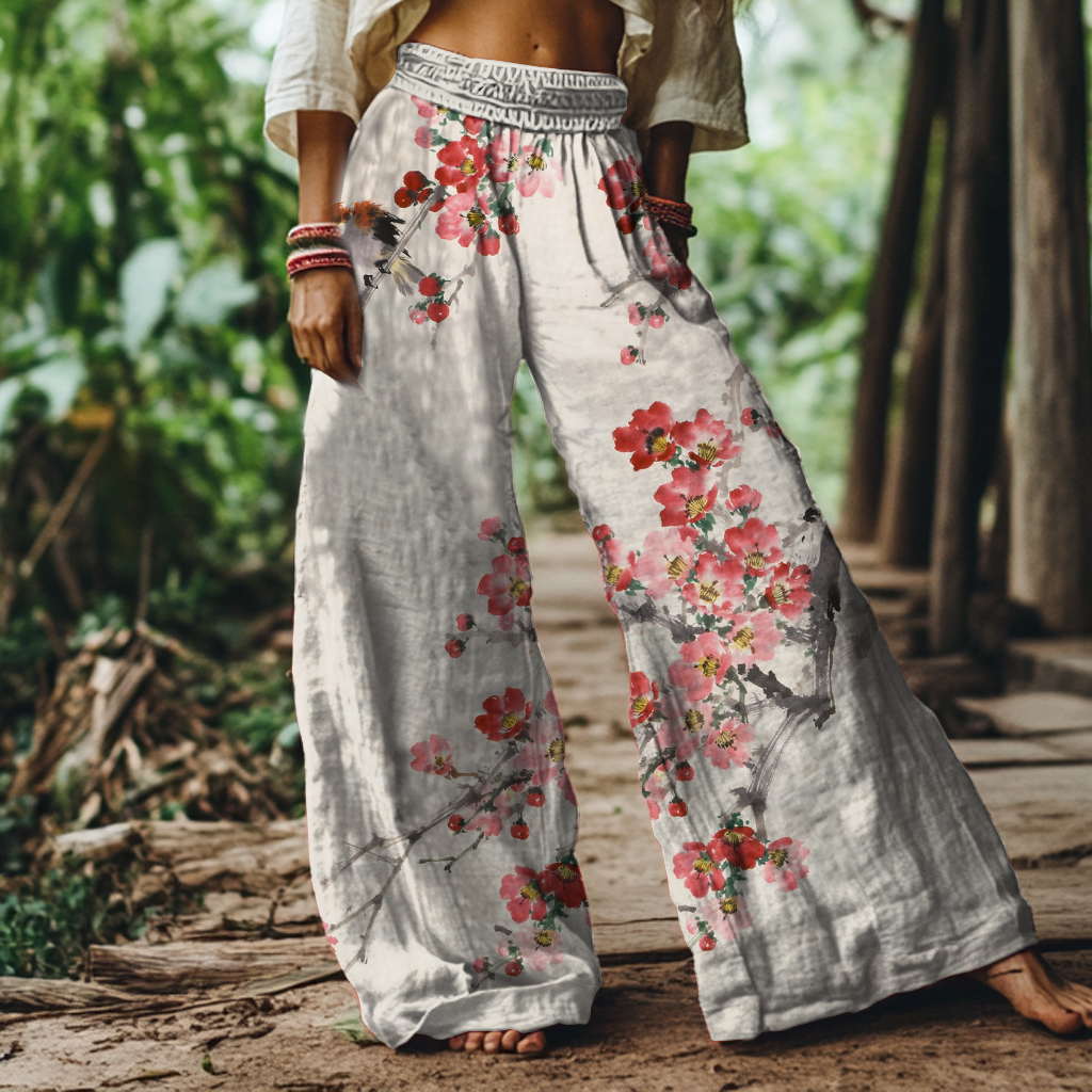 Vintage Floral and Bird Art Print Loose Wide-leg Pants