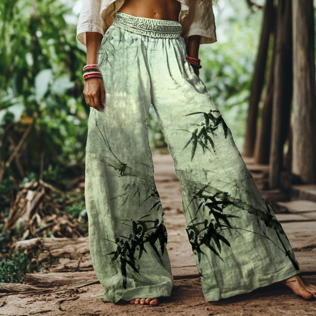 Vintage Bamboo Art Print Loose Wide Leg Pants