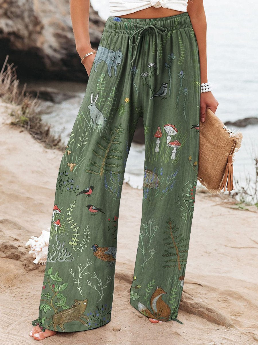 Woodland And Animal Pattern Printed Women's Cotton And Linen Casual Pants