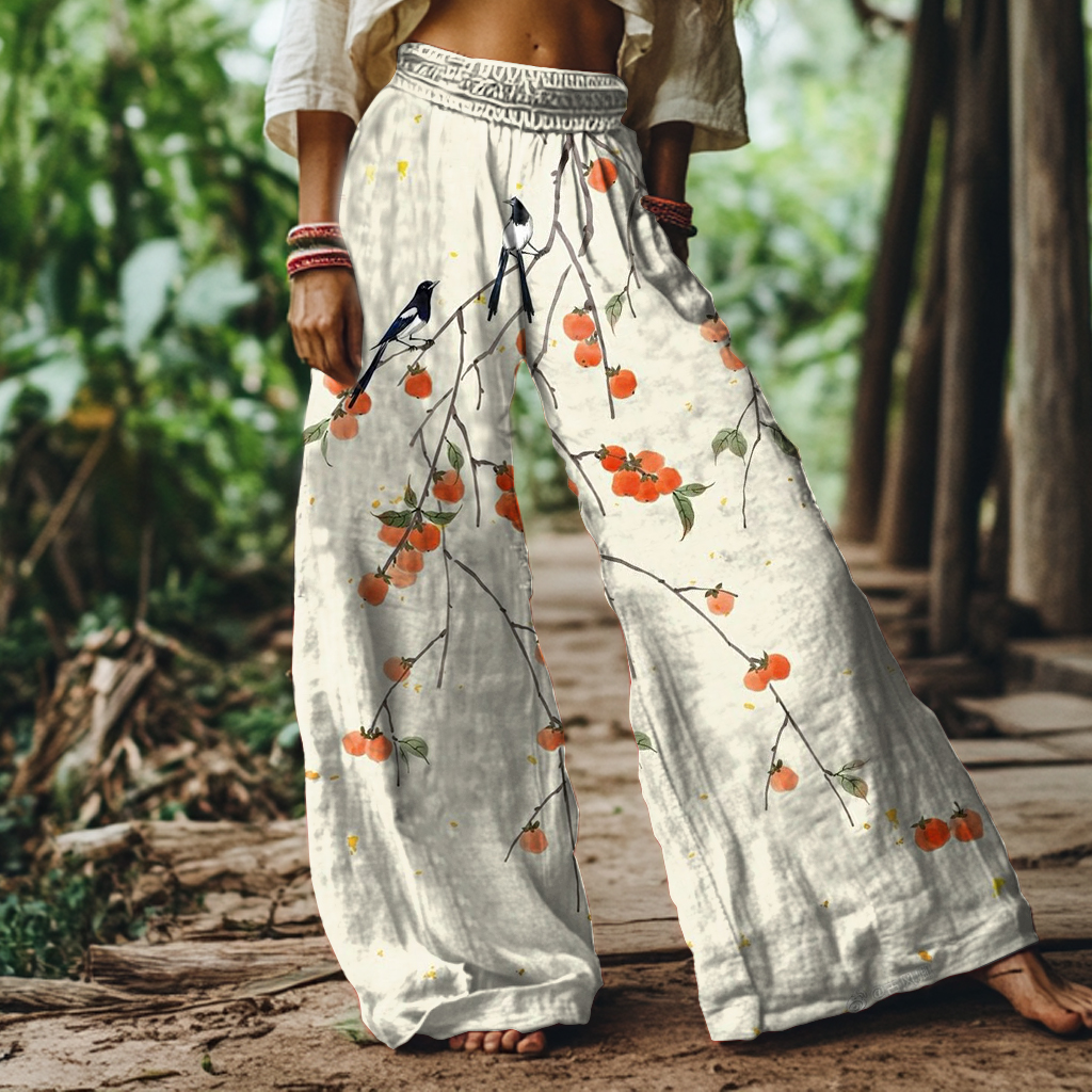 Vintage Persimmon Bird Art Print Loose Wide Leg Pants