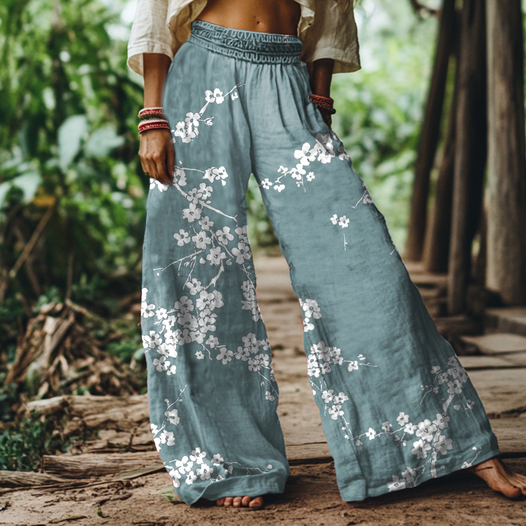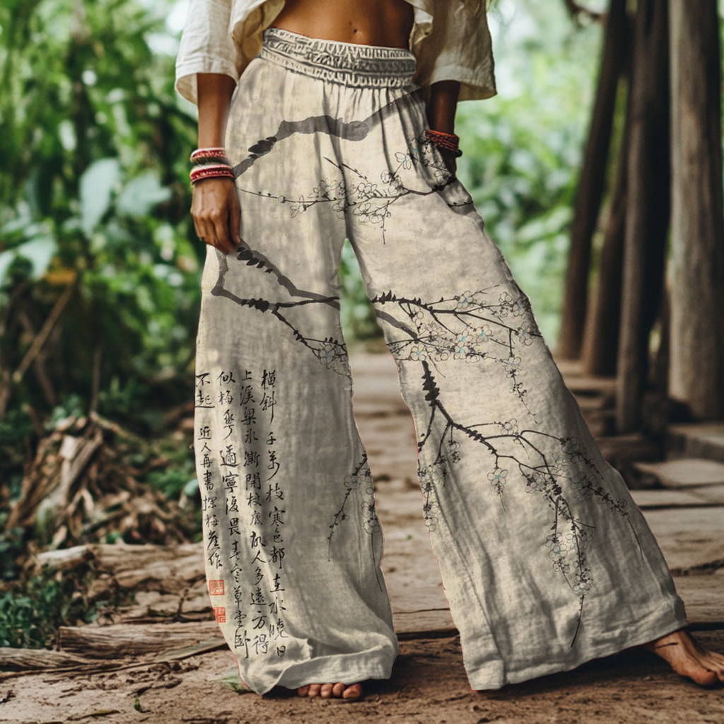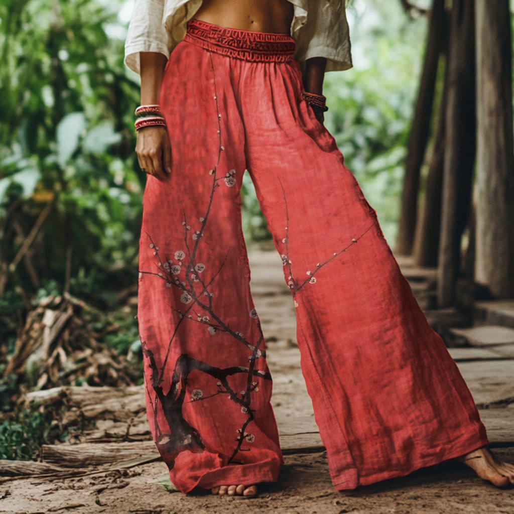 Retro Japanese Plum Blossom Print Loose Pants