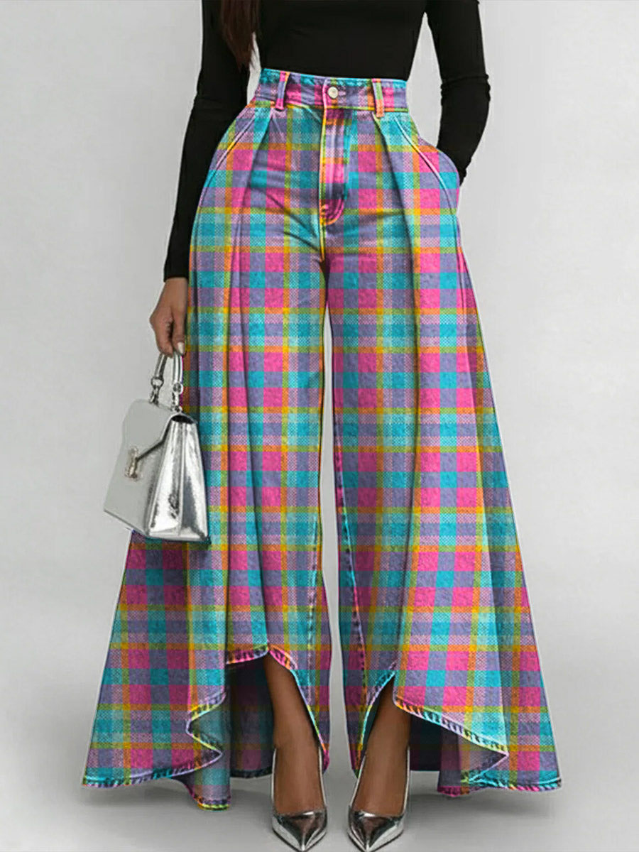 Women's Plaid Art Print Casual High-waist Loose Jeans