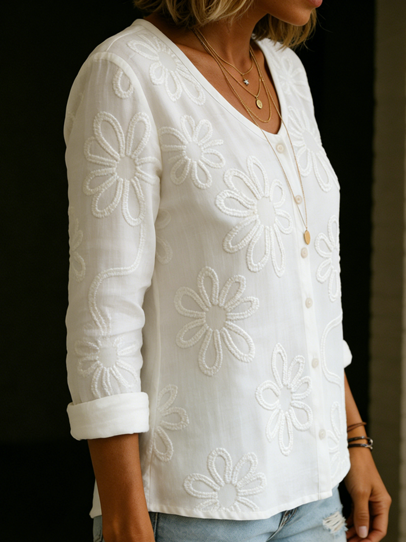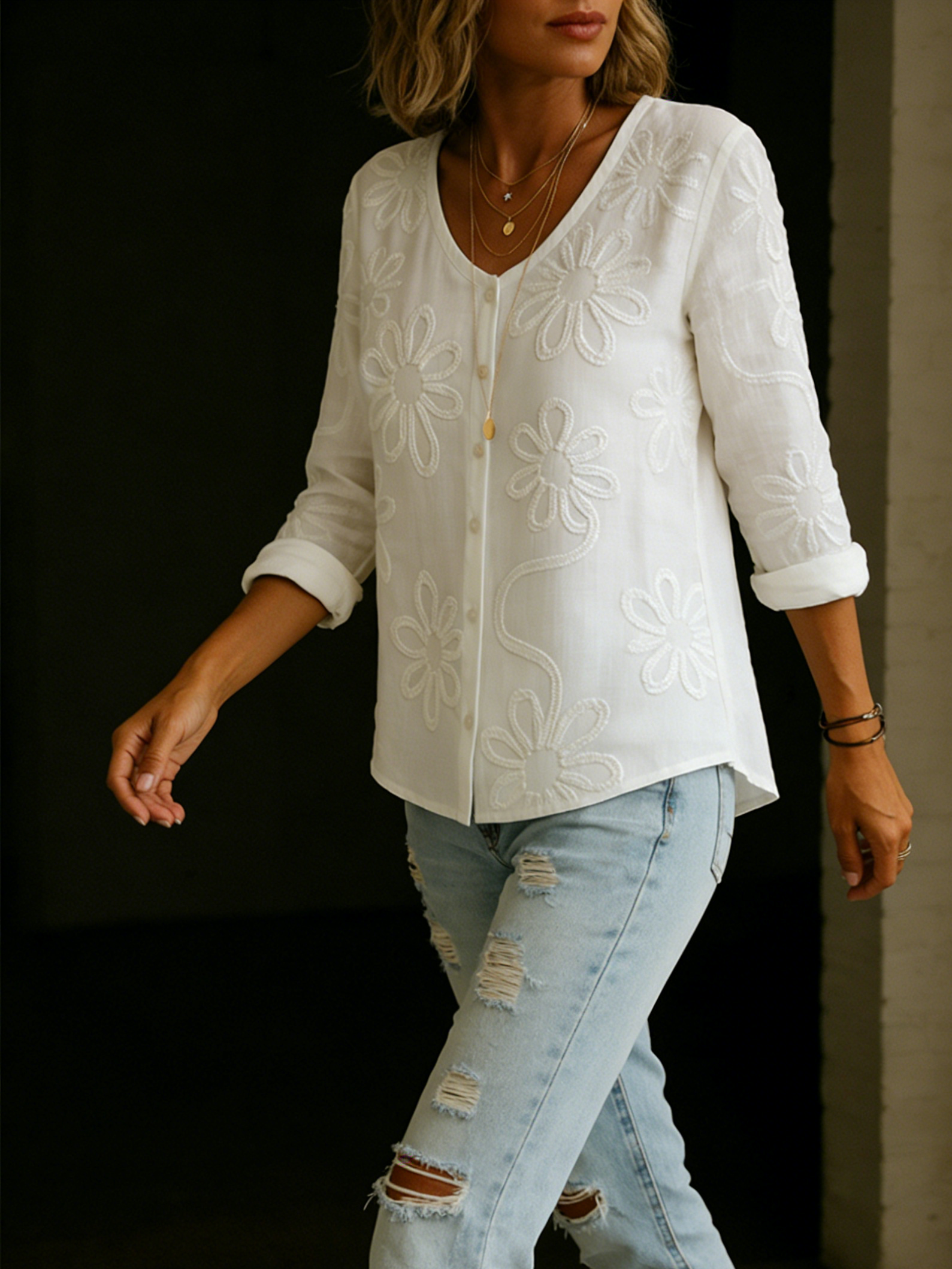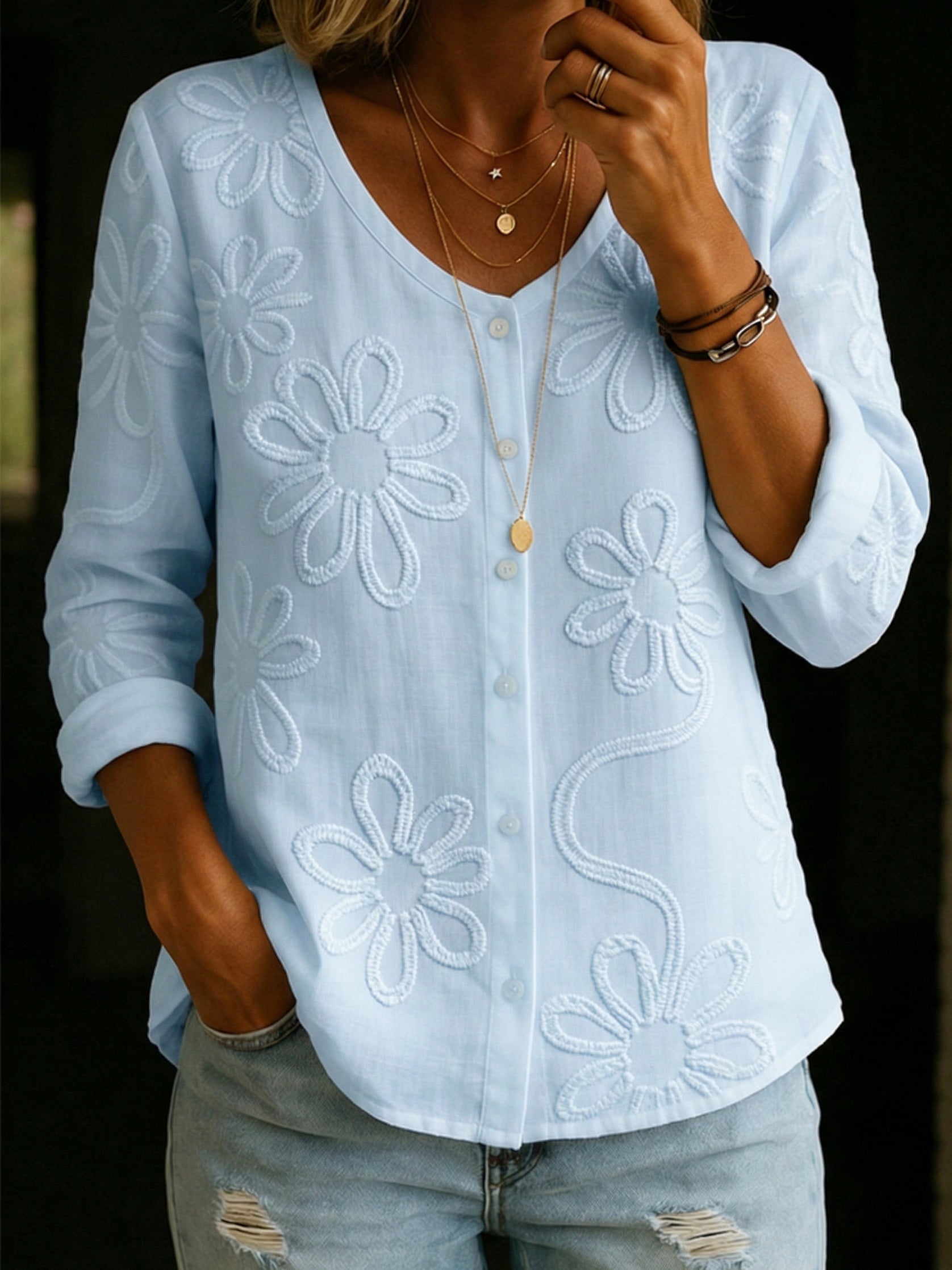 Romantic V-neck Floral Embroidered Shirt