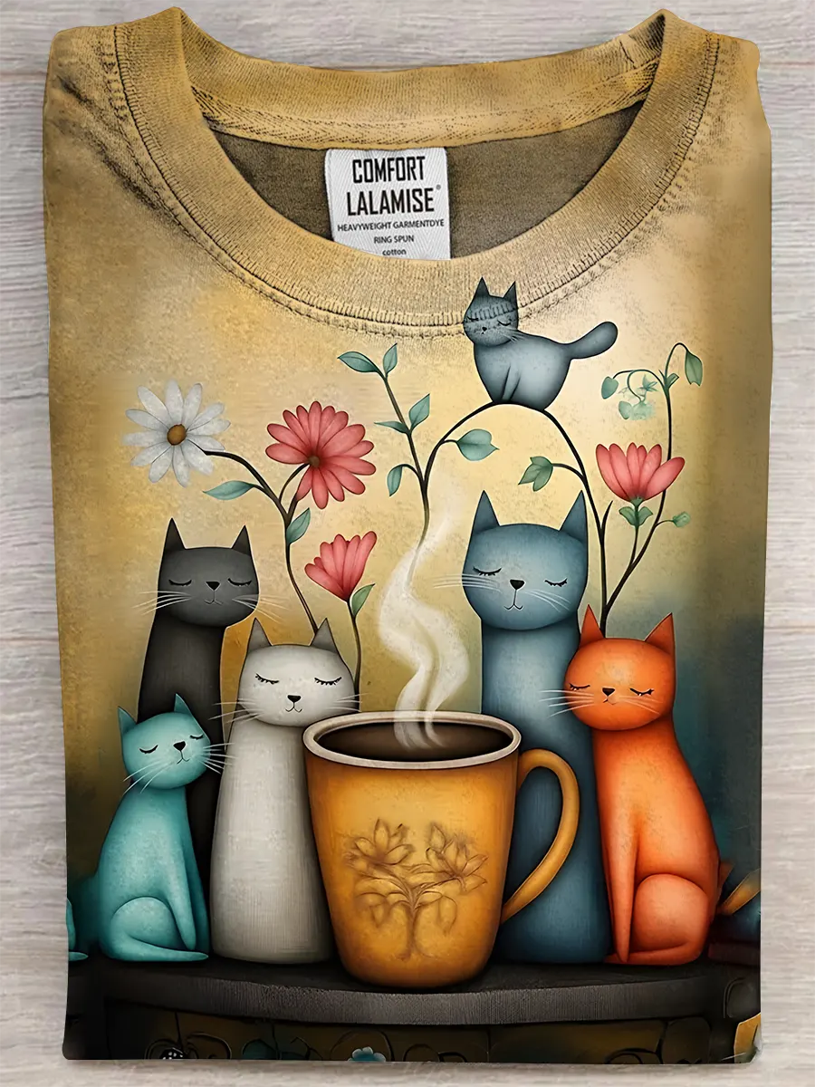 Retro Cat Flowers Art Print Casual Pure Cotton Short Sleeved T-shirt