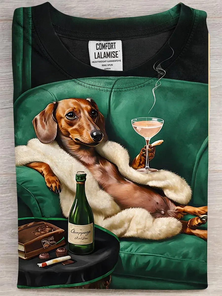 Retro Cute Dachshund Drink Art Print Casual Cotton Short Sleeved T-shirt