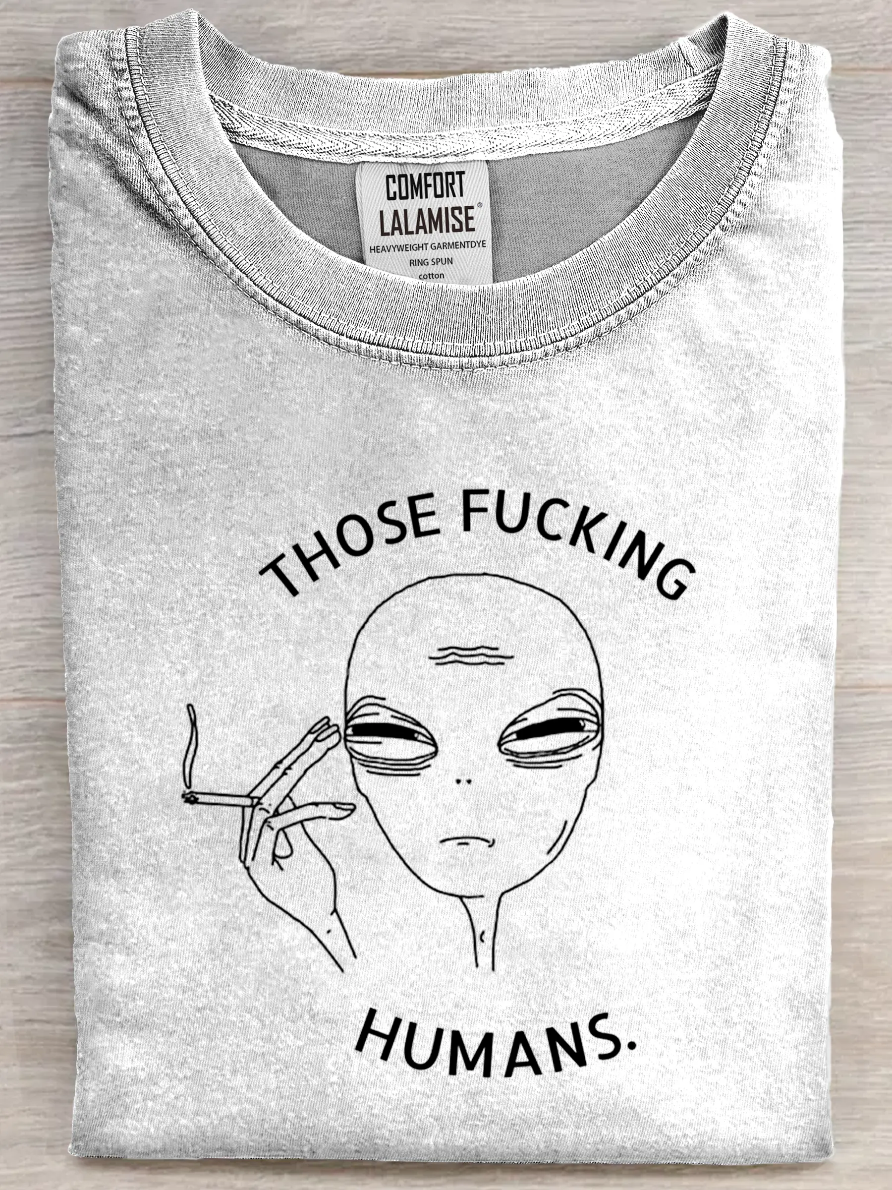 Those Fucking Humans Funny Smoking Alien Art Print Casual Cotton Short Sleeve T-shirt