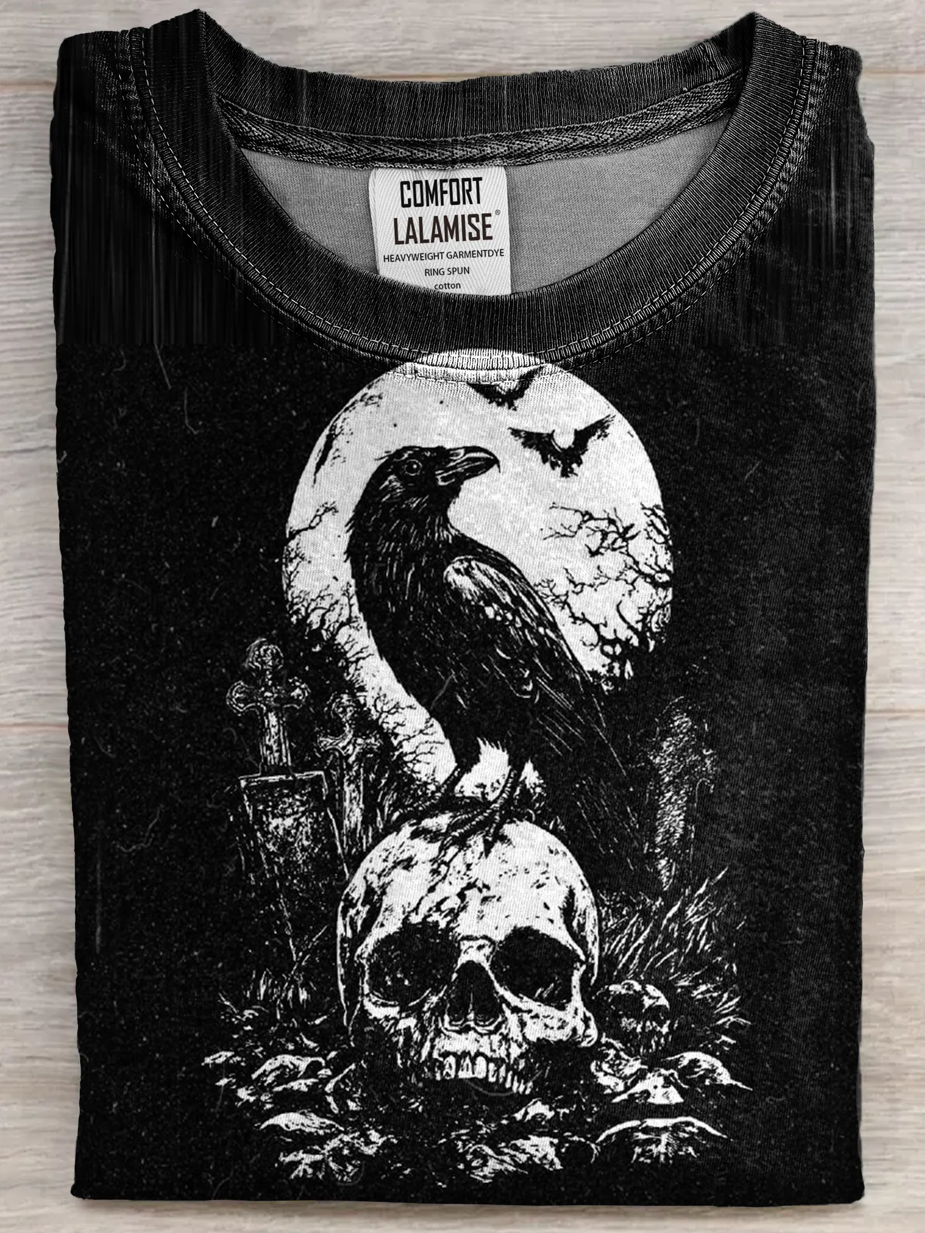 Funny Dark Skull And Raven Art Print Casual Cotton Short Sleeve T-shirt