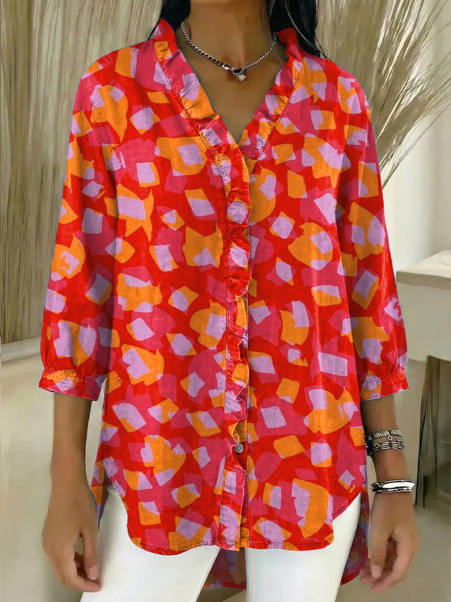 Women's Vintage Geometric Print Casual Ruffled Shirt