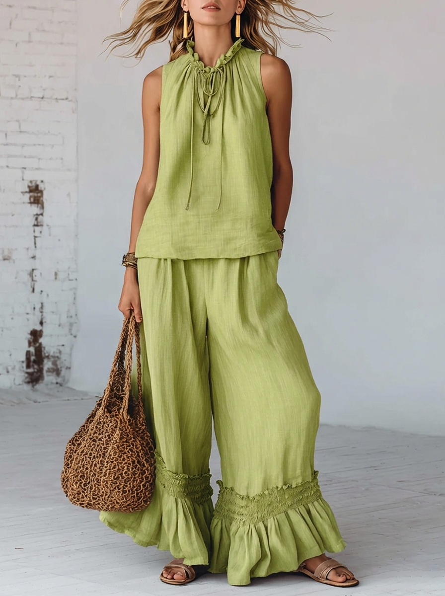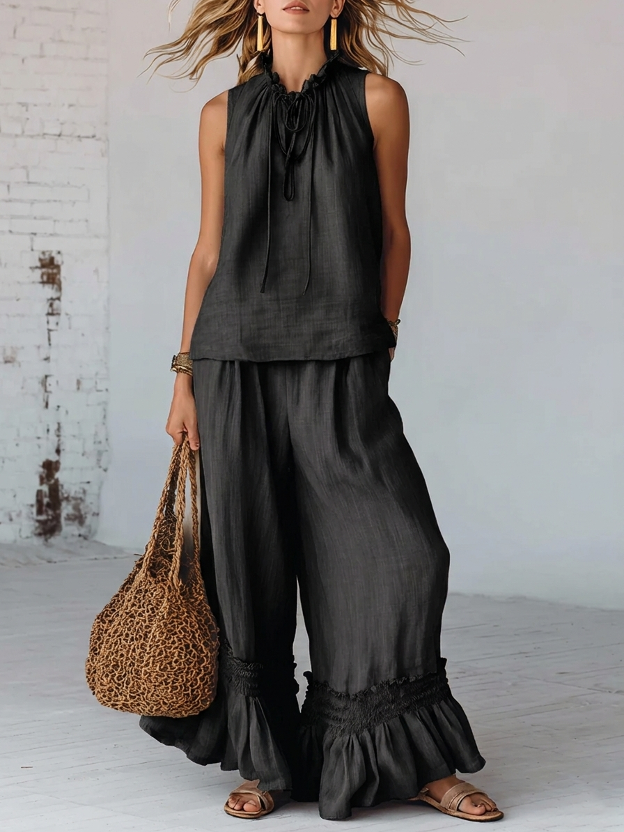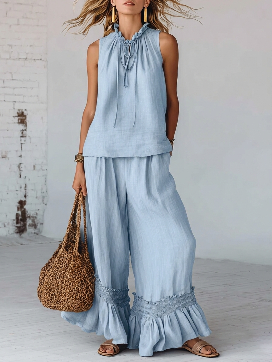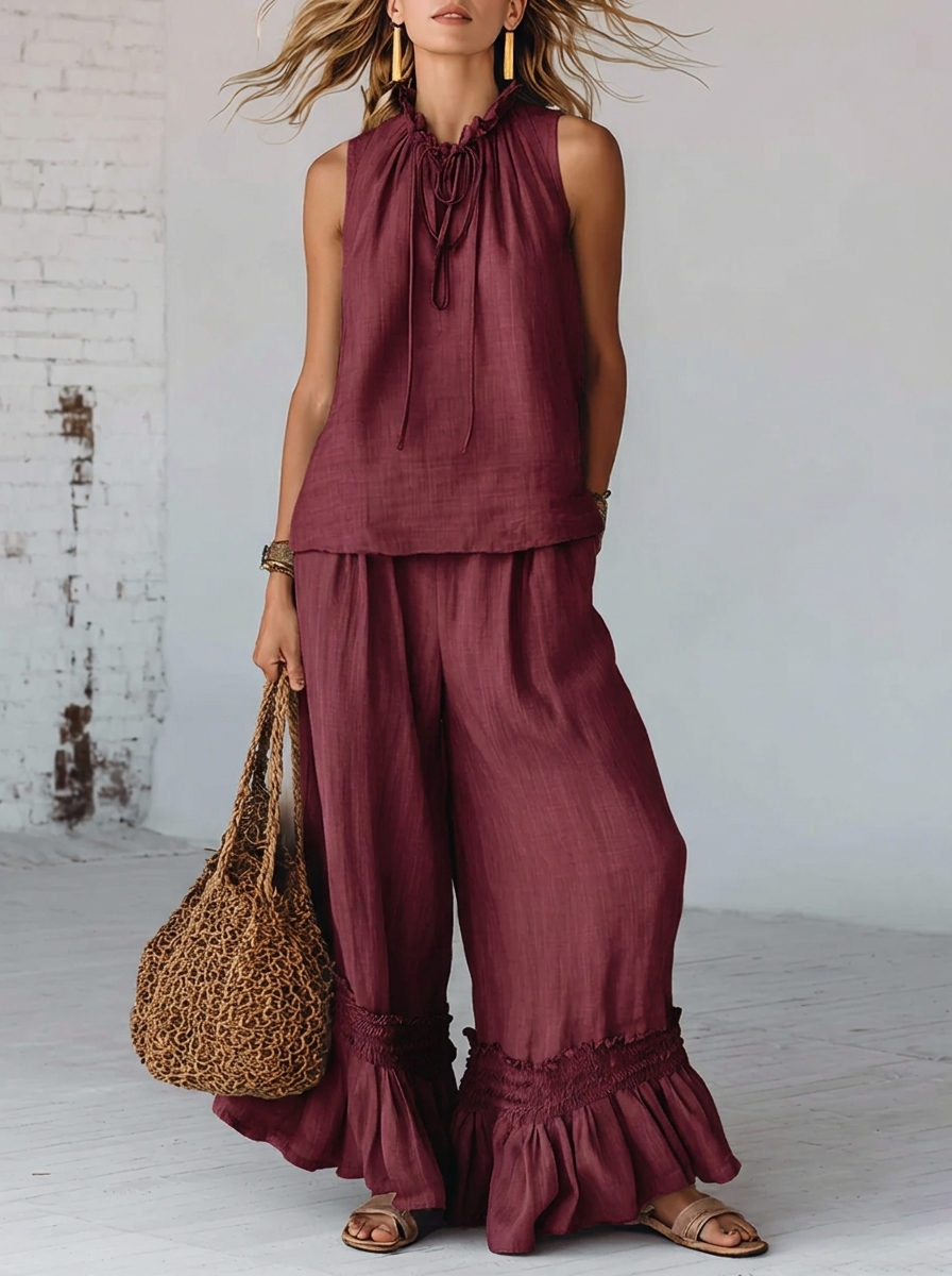 Bohemian Lace-up Blouse And Ruffled Wide-leg Pant Linen Set