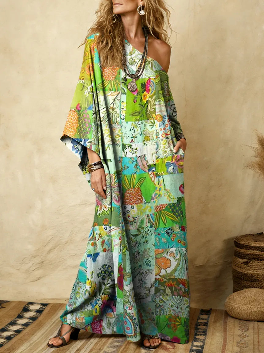 Women's Bohemian Floral Patchwork Art Print Kaftan Dress
