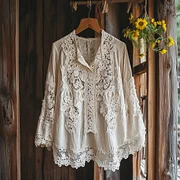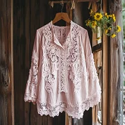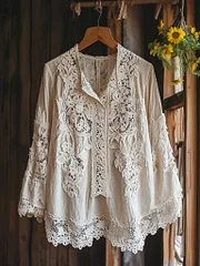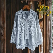 Women's Retro Floral Lace Embroidery Art V-neck Shirt