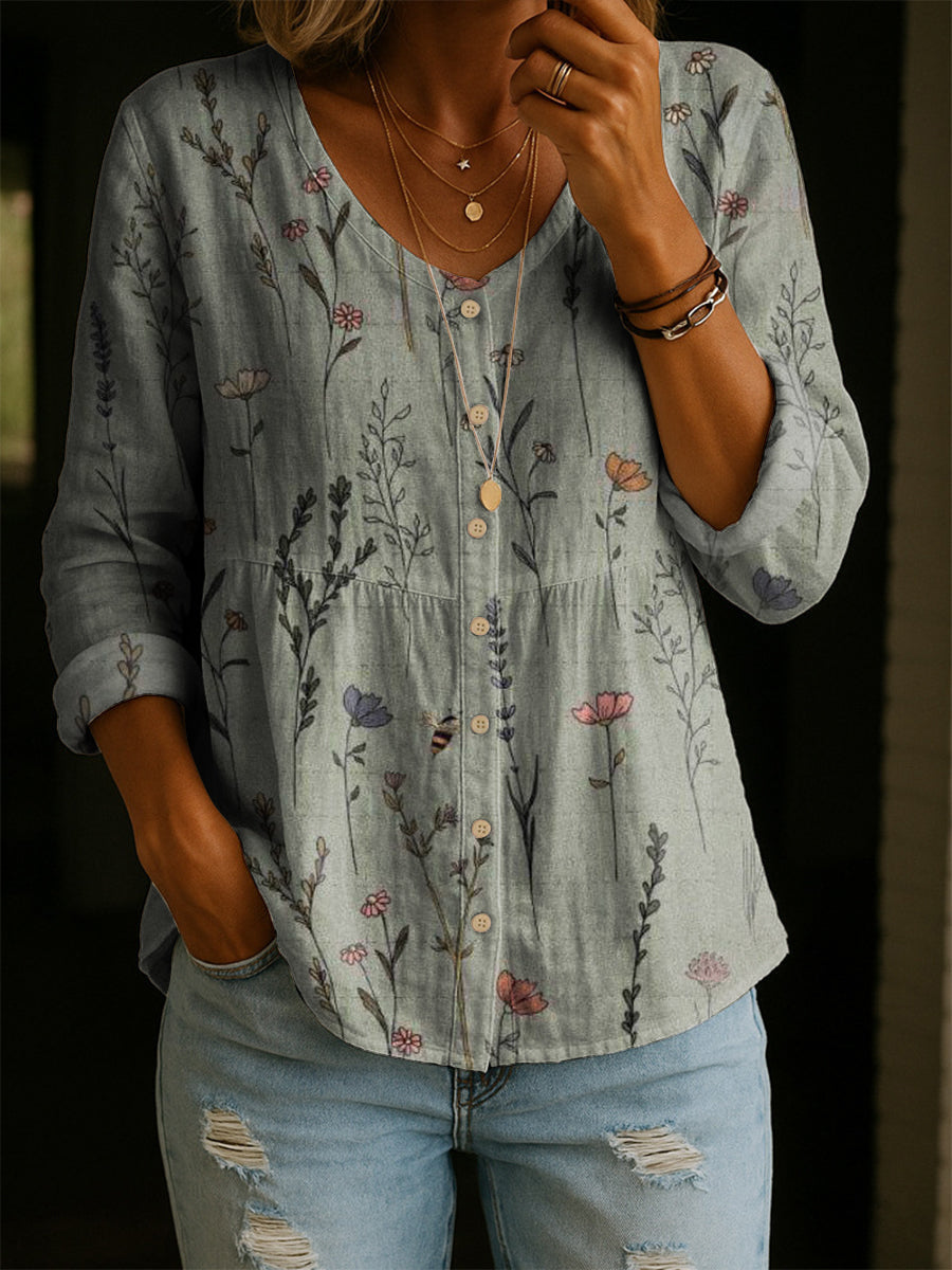 Women's Vintage Flower Pattern Art Print Casual Cotton Shirt