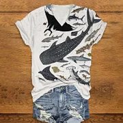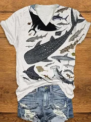 Women's Retro Dolphin Fish Flow Sea Art Print V Neck Tee