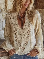 Women's Vintage Floral Lace Embroidery Art V-neck Blouses