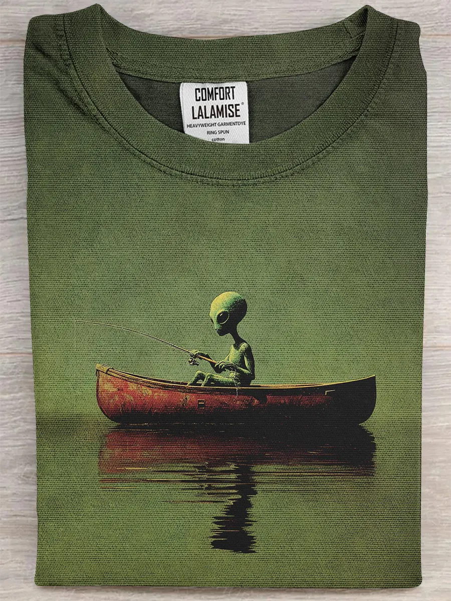 Retro Et Fishing Fun Art Print Casual Pure Cotton Short Sleeved T-shirt