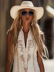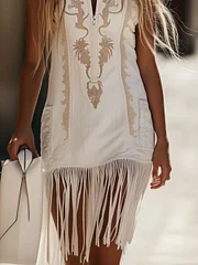 【24-hour shipping out】Casual Retro Bohemian Embroidered Sleeveless White Denim Tassel Mini Dress
