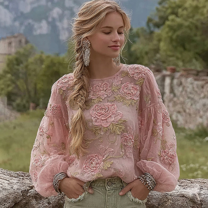Elegant Bohemian-style Pink Rose Embroidered Comfortable Casual Linen Waist-cinching Top