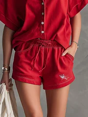 Retro-style Sporty Red Cotton Collared Button-down Top And Shorts Set