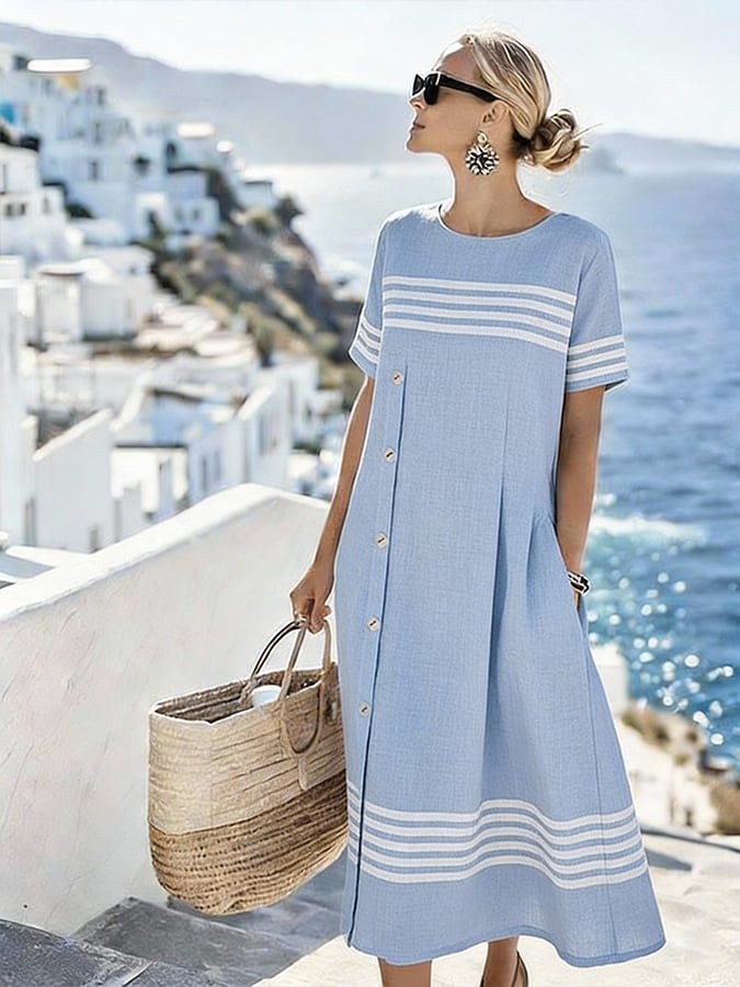 Women'S Casual Color-Block Cotton And Linen Dress