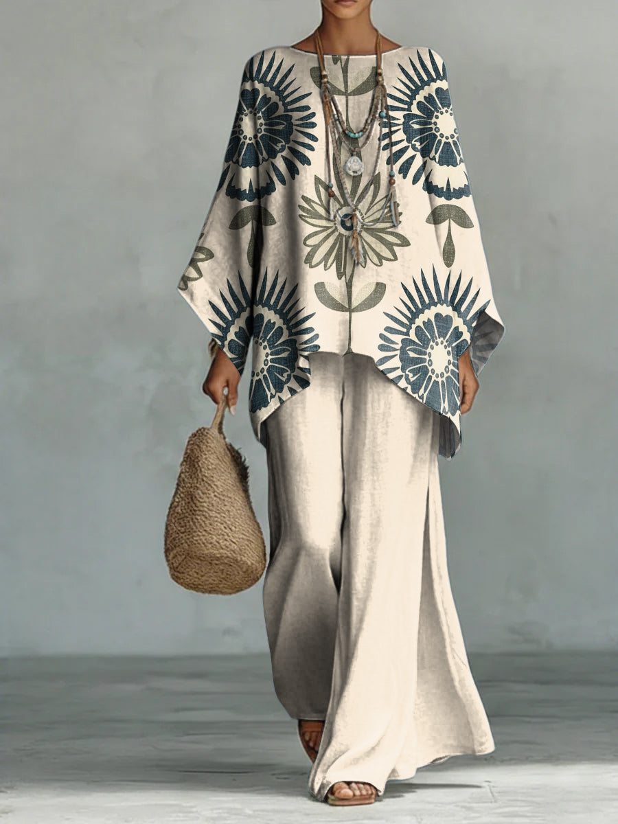 Artistic Style Minimalist Floral Decorative Pattern Woman's Casual Long Sleeve Cotton Top And Pants