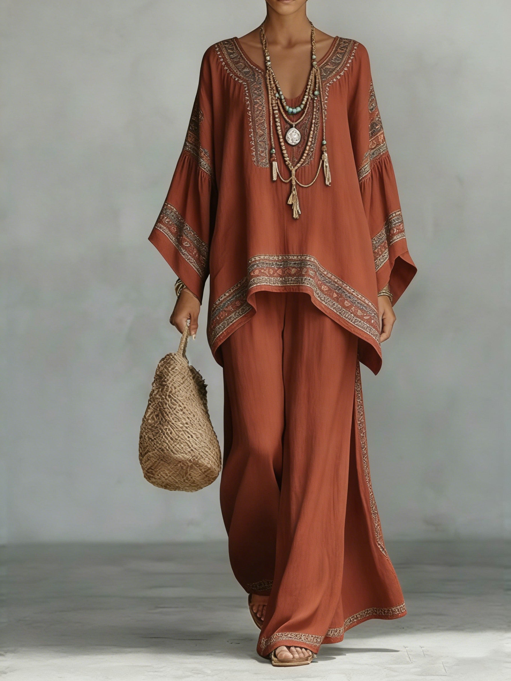 Women's Comfortable and loose print pattern cotton and linen wide-leg pants two-piece set